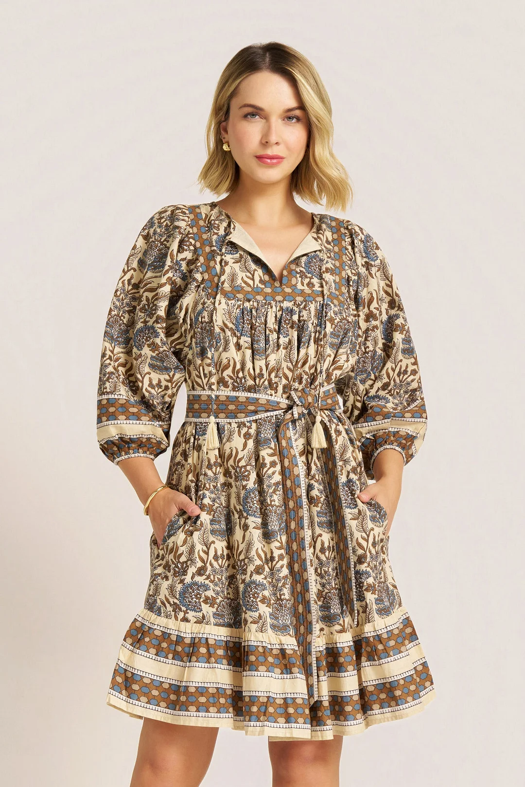 Printed cotton mini dress with a relaxed, romantic silhouette, the Cassia is crafted from soft organic cotton. A tassel-tie neckline and blouson sleeves with elastic cuffs bring a touch of movement, while contrast bands frame the floral and geometric print with subtle detail. Finished with side pockets, it’s the kind of piece that feels easy, polished, and ready for every season.